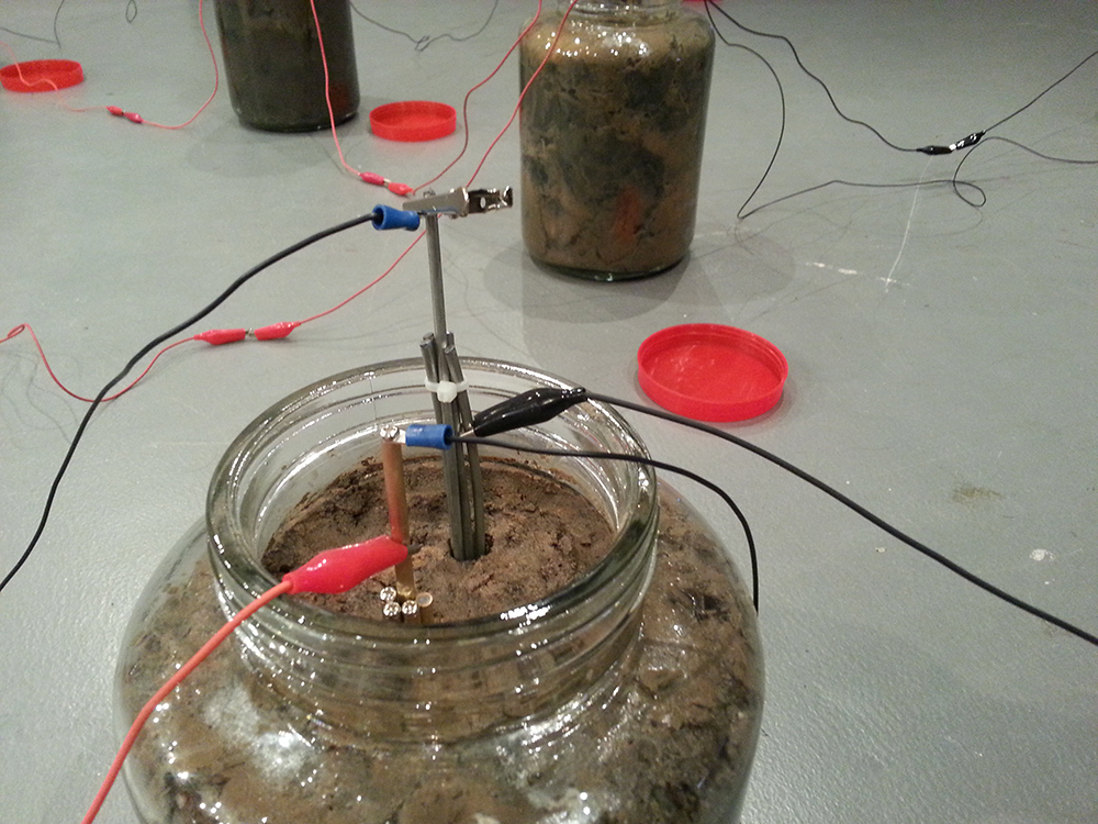 For this installation, the artist extracted soil from Seletar in northeastern Singapore. The soil was placed in an array of glass bottles and used to produce sufficient electricity to vibrate two small metal plates against each other. The impact of the metal plates creates a small hammering sound against clay bowls made from the same soil and fired in a kiln. The fired clay shapes amplify the small hammering sounds powered by the Earth battery array.